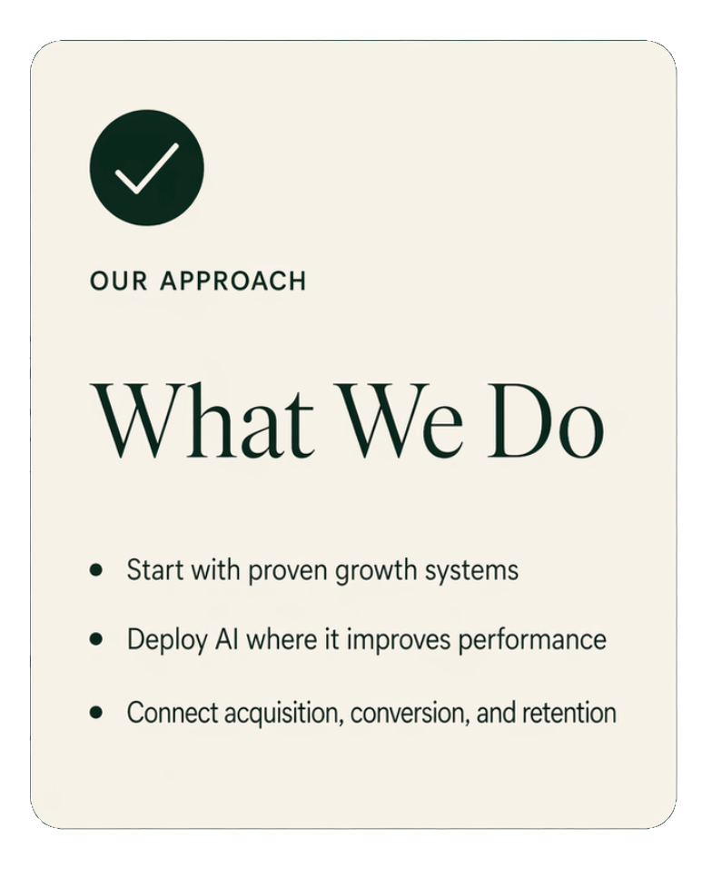 We start with our own proven growth systems, then deploy AI where it actually improves performance.
