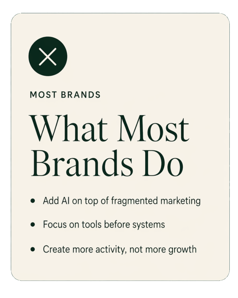 Too many brands do the opposite. They add AI on top of disconnected marketing and expect it to create scale. But AI still needs to be built into the systems that drive acquisition, conversion, and retention. Otherwise, you’re automating motion, not growth.