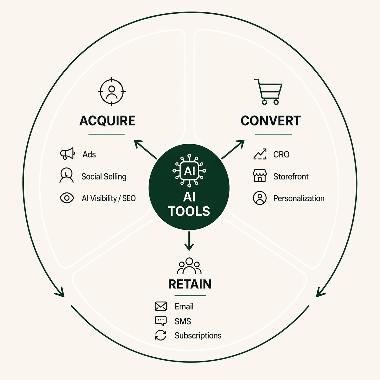 Growth compounds when acquisition, conversion, and retention work together as one system. We’ve used that proven model to help eCommerce brands grow for years. Now, we’ve integrated AI throughout our entire system, making sure every stage performs smarter and converts better, helping your brand scale faster.